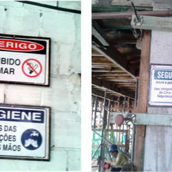 A sinalização canteiro de obras é produzida em total consonância com os últimos conceitos de sinalização laboral e se baseiam nas normas regulamentadoras NR-18 e NR-26 do Corpo de Bombeiros, que obrigam o uso de sinalização adequada no ambiente laboral como também a implementação das cores-padrão que devem ser utilizadas nas placas para a prevenção de acidentes. A sinalização conta também com o diferencial de ter bagagem de mais de dez anos n...
